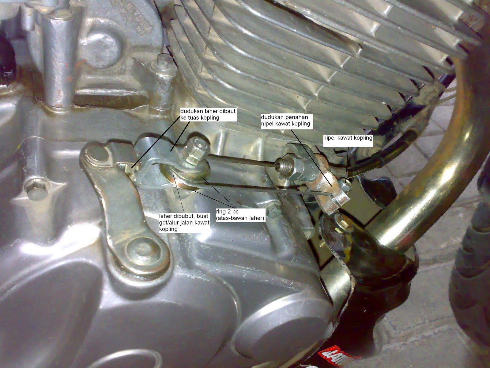 Warning!!! Trik ini hanya bisa dipake bila pake kabel kopling los-losan, alias bukan ori. Karena butuh agak panjang dari ukuran normal. Trus dipasang nepel ke as pengungkit di atas blok mesin kanan.