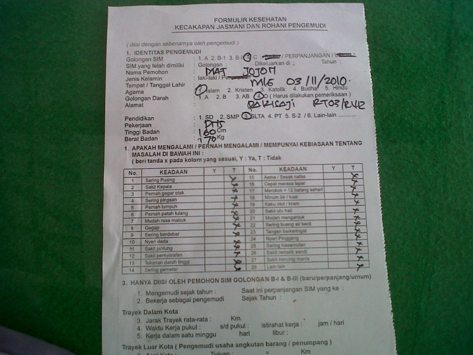 Parkir di belakang, trus cari informasi didalam. Prosedur perpanjangan SIM harus membawa fotokopi KTP dan SIM lama sebanyak 3 lembar. Nah, mulai deh ribetnya. Sebelum dapat formulir, kita harus tes kesehatan dulu. Tempat tesnya ternyata ada di luar area SATPAS. Alamak, jalan kaki lumayan, keluar area SATPAS. Tempat tes kesehatan, ada di pinggir jalan raya, sekitar 200 meteran sebelah utara SATPAS. Sudah antri penuh, plus dirubung makelar alias calo. Ke petugasnya ngasi FC KTP-SIM 1 lembar, sambil ngisi formulir. Trus dibalikin, sambil antri nunggu dipanggil.