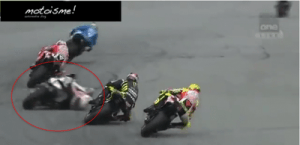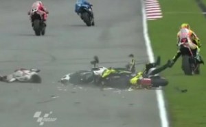 Simoncelli, pada saat lap kedua, berebut posisi dengan Bautista (Suzuki). Ketika menikung, dia loose grip dan tergelincir pas tikungan. Sialnya, motor terseret ke arah kanan, dan posisi tubuh Simoncelli tergeletak di tengah lintasan, tepat pada racing line. Colin Edwards, yang melaju pada kecepatan tinggi pada racing line, tidak mampu menghindar. Crash-pun terjadi, Edwards melindas tubuh Simoncelli. Sekilas, yang terlihat, mengenai area punggung hingga leher, sampai helm Simoncelli terlepas. Edwards ikut terjungkal, diserempet pula oleh Valentino Rossi yang melaju persis di belakangnya. Rossi out ke gravel, namun selamat dan masih bisa kembali ke trek. Kondisi Edwards sendiri mengalami cedera bahu (dislokasi).