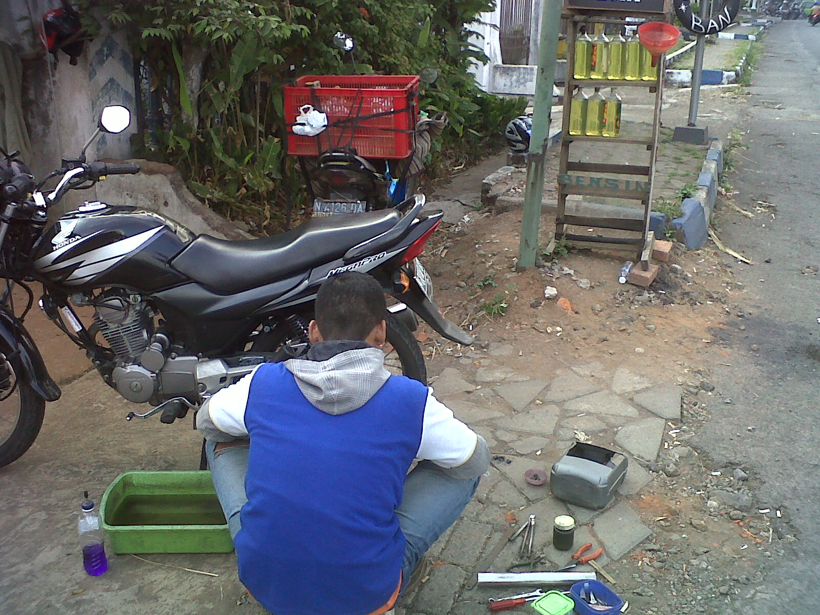 Sobekan dijahit dulu sedikit, trus dikasi lem, trus ditambal karet agak lebar. Baru dipanasi. Sambil nunggu merekat sempurna, kami ngobrol. Mas ini emang tukang tambal ban keliling sekaligus jual bencin ecerean. Beliau buka alias stand by mulai jam 6 sore sampe pagi di lokasi itu. Berbekal Suzuki Smash 2009, dengan keranjang di jok belakang berisi botol bensin, perkakas tambal, pompa tangan dan tikar, itulah rekan kerjanya.