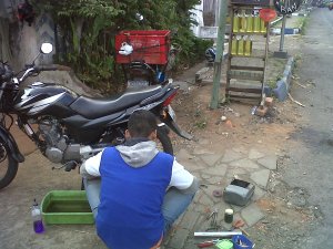 Singkat cerita, lem merekat sempurna. Di tes, dah gak ada yang bocor lagi. Pasang ban ke velg, ngok—ngok–ngokk…. si mas mompa ban pake pompa tangan. beres, saia tanya ongkos. Cuma IDR 7 ribu masbro…akhirnya saia serahkan lembaran 10 ribuan sambil pesan gak usah dikembalikan sisanya. Mas tadi senyum sambil bilang makasih. Dia membereskan peralatan, bersiap pulang. Saia juga bersiap neruskan ke gereja. “Ngaso mas habis ini?” saia nanya sambil menghidupkan motor. Mas-nya jawab, “Yo siyap-siyap mas, abis mandi , trus ke gereja juga sama keluarga.” Whoalah, ternyata ketemu saudara seiman. Saia salami sambil pamitan…