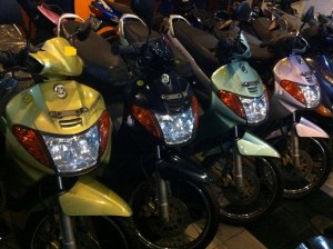 Kalo jenisnya, ada Yamaha Nuovo generasi awal, biasanya dikasi istilah “Nuovo Lele” (karena bentuk headlamp pipih kayak kepala ikan lele) tahun 2002 dan 2003. Nah lo, 9 tahun lewat, masih ada barang barunya??? Kilometer masih 2 kiloan, alias gak jalan kemana-mana.