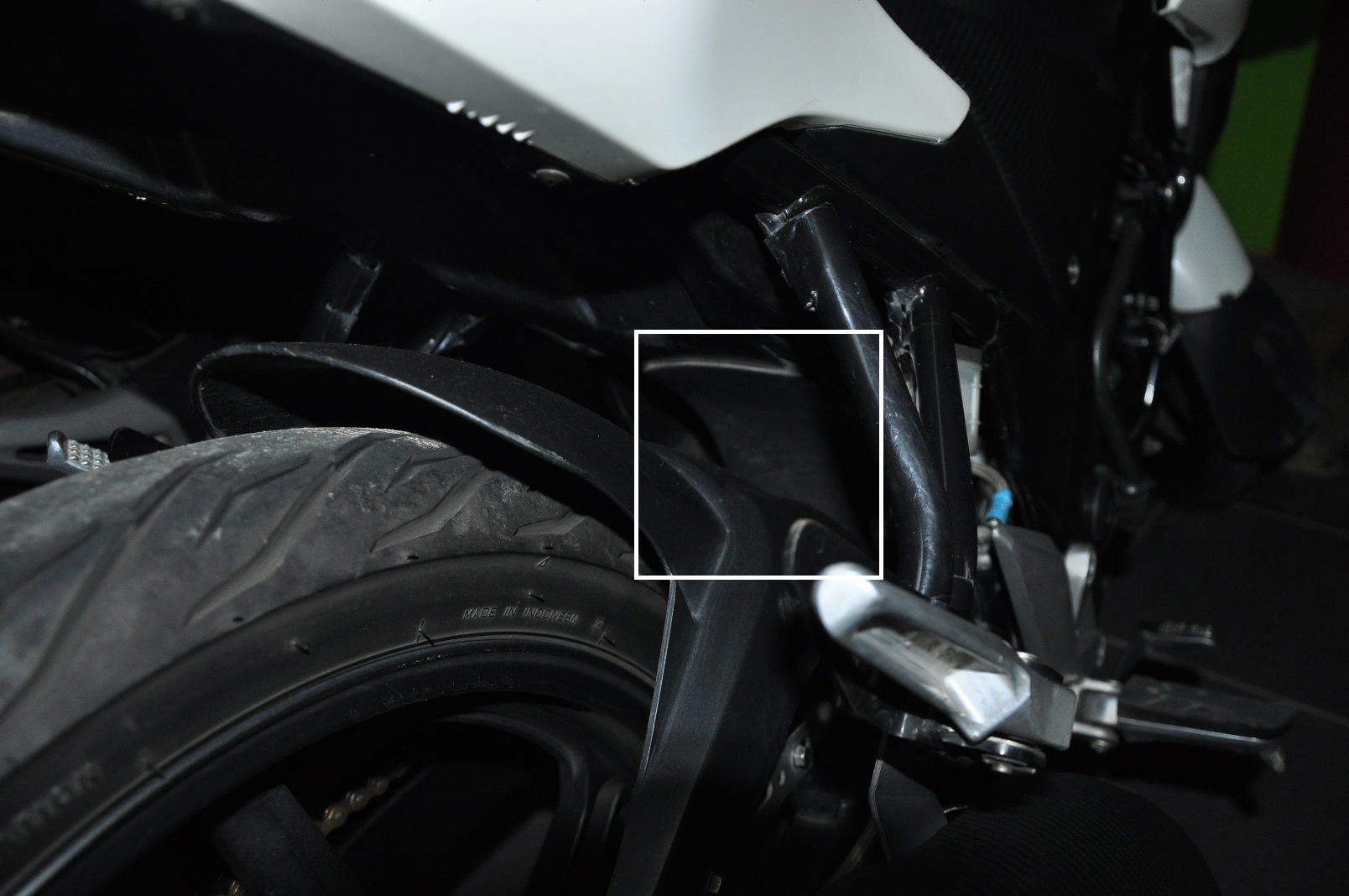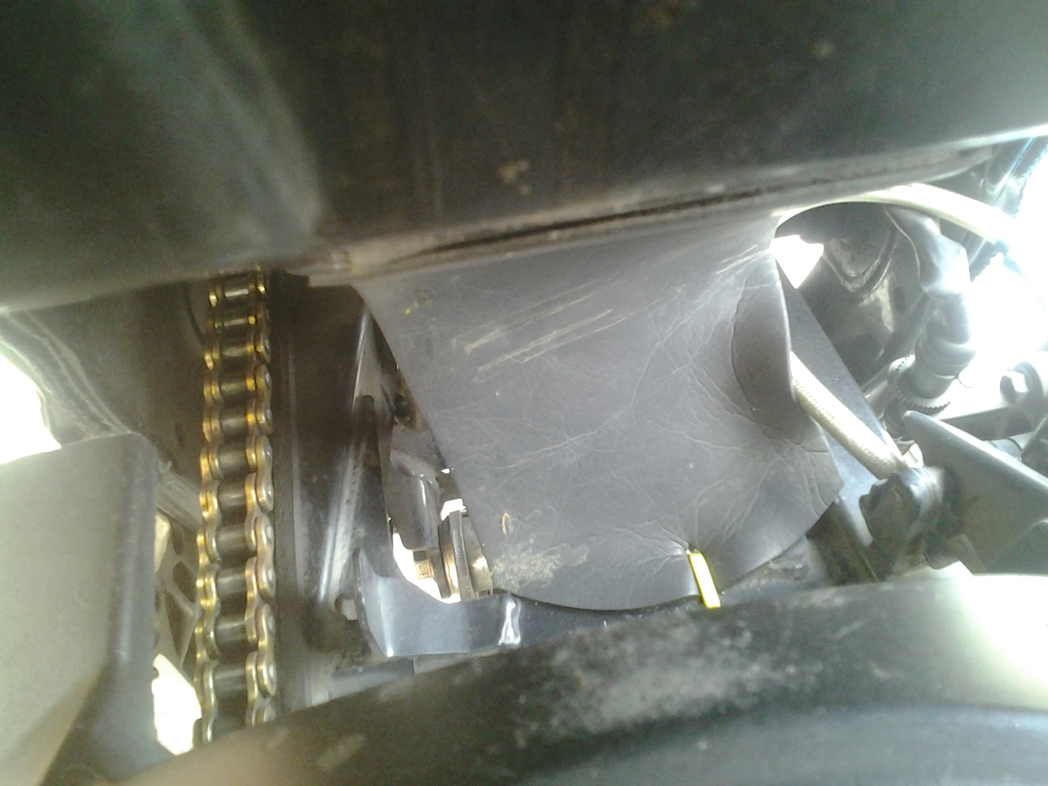 Nah, ujung bawahnya, silakan diikat pake cable ties ke tengah-tengah swing arm. Beres. Maaf kalo fotonya kurang jelas. Semoga berguna trik kecil ini 😉
