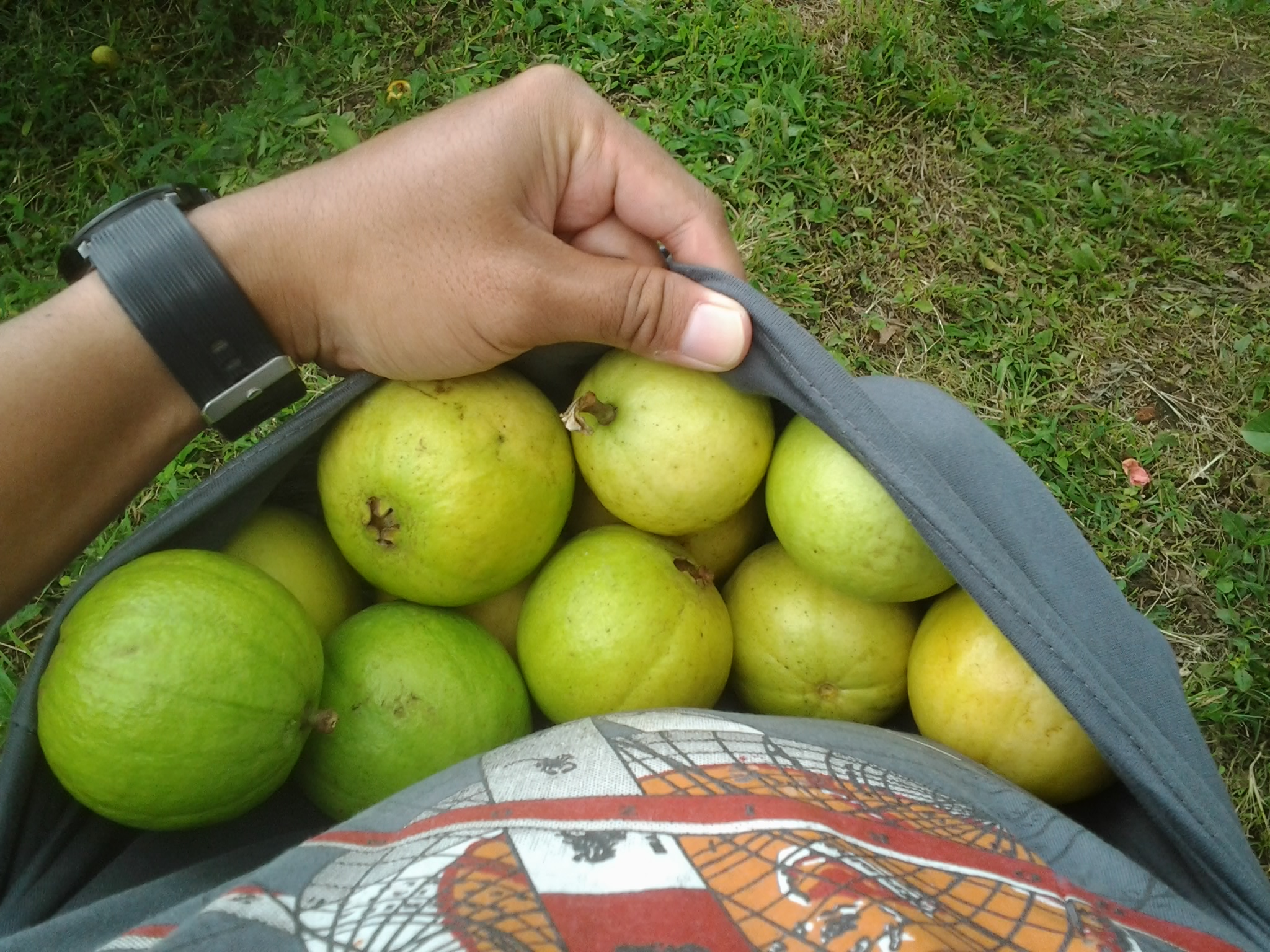 Ditemani gerimis, akhirnya SSI dengan mbak pemandu berhasil nego sehingga dibolehkan ambil buah jambu sampe 3 buah per orang, hehehe Sayang seribu sayang, pengunjung tidak dibekali dengan wadah/tempat buah yang sudah dipetik, jadi, kalo gak bawa akhirnya seperti ini.