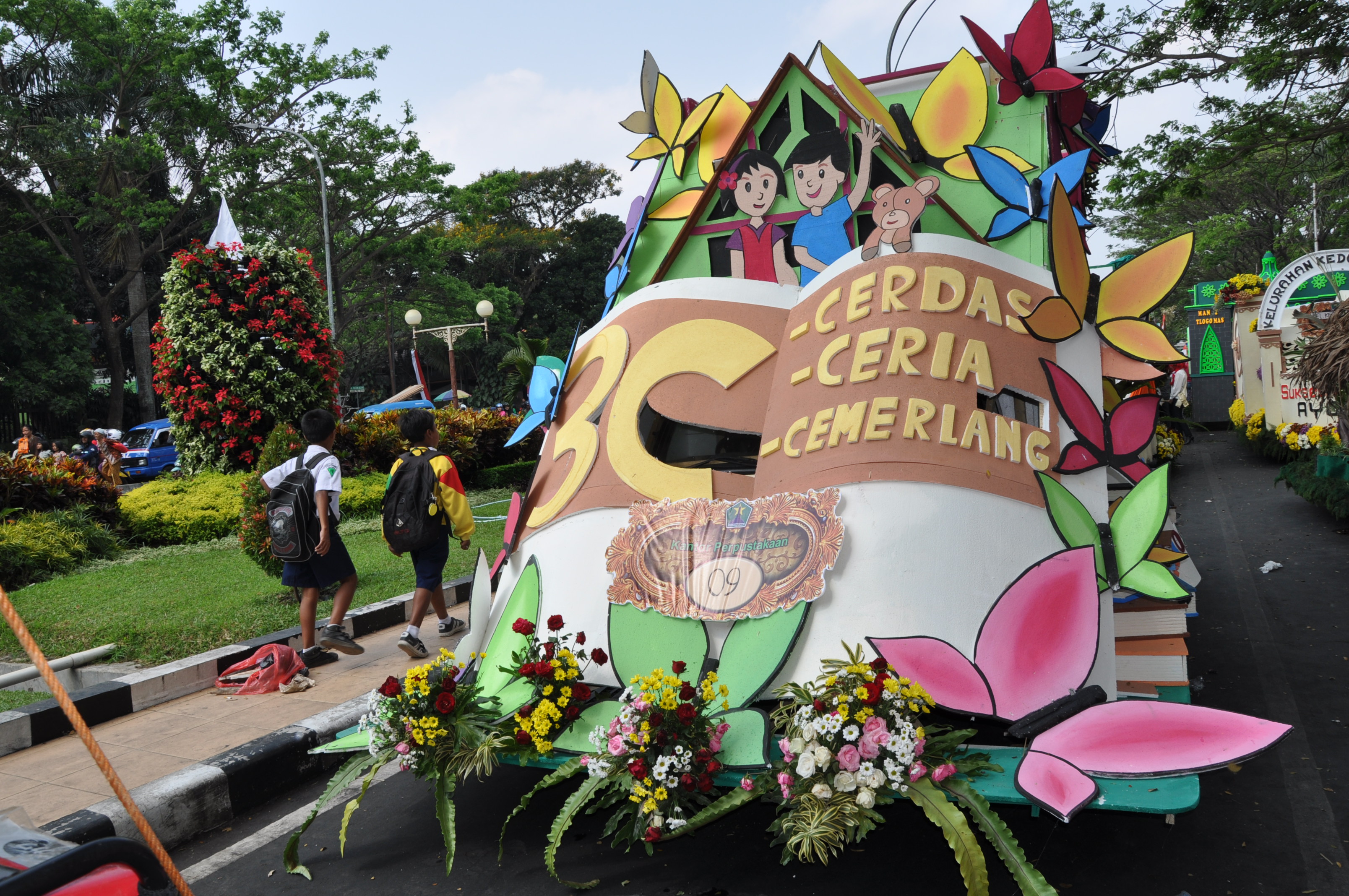 Last, masih tetap diperlukan navigator alias pemandu sih, untuk aba-aba manual sekaligus mengamankan jalur yang akan dilewati. Maklum, penonton sangat antusias (baca:jahil). Untuk kendaraan hias yang dianggap menarik dan bisa diusili, bakalan banyak yang lepas deh hiasan yang nempel di bodi kendaraan. Hehehehe, ya maklum saja lah, ini juga termasuk hiburan untuk masyarakat. Nah, saia dan seorang kawan sekaligus juru foto yang kebagian tugas itu . Meskipun tidak sukses mengamankan, setidaknya hingga garis finish, kondisi mobil hias masih 90 %