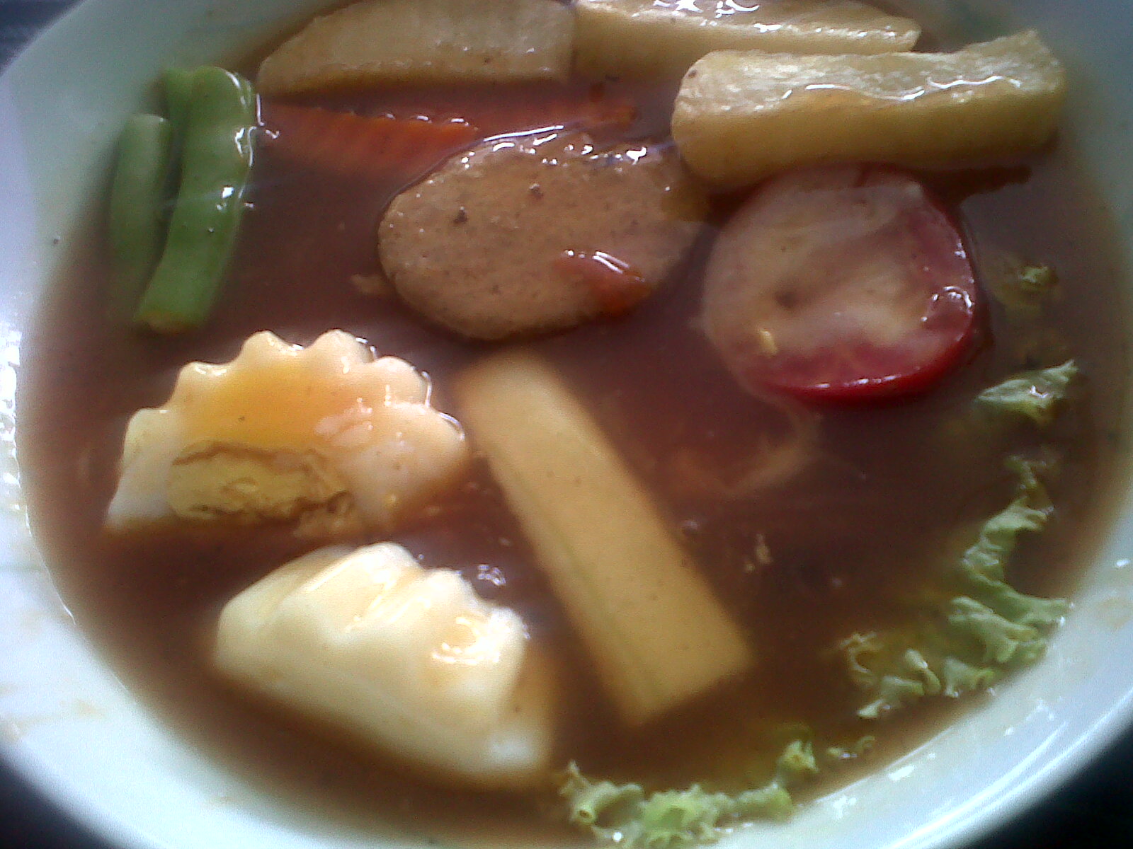 Akhirnya, selesai ambil gambar, langsung sikat beserta nasi. Hemm..maknyuss..asli enak. Sayuran kukusnya gak terlalu matang, jadi masih ada tekstur renyah khas sayur, tapi juga gak mentah. Trus bintangnya, yaitu dagingnya, mmmm…mirip sama olahan daging yang buat isian burger itu lho masbro..gurih, meski ada rasa tepungnya. Sementara kuah saosnya, mirip kuah capcay dan sejenisnya, hanya rasa asam-manis lebih dominan, tanpa rasa pedas sama sekali. Mangkanya, disediakan sambal-garam di meja, bila ada yang merasa kurang cocok.