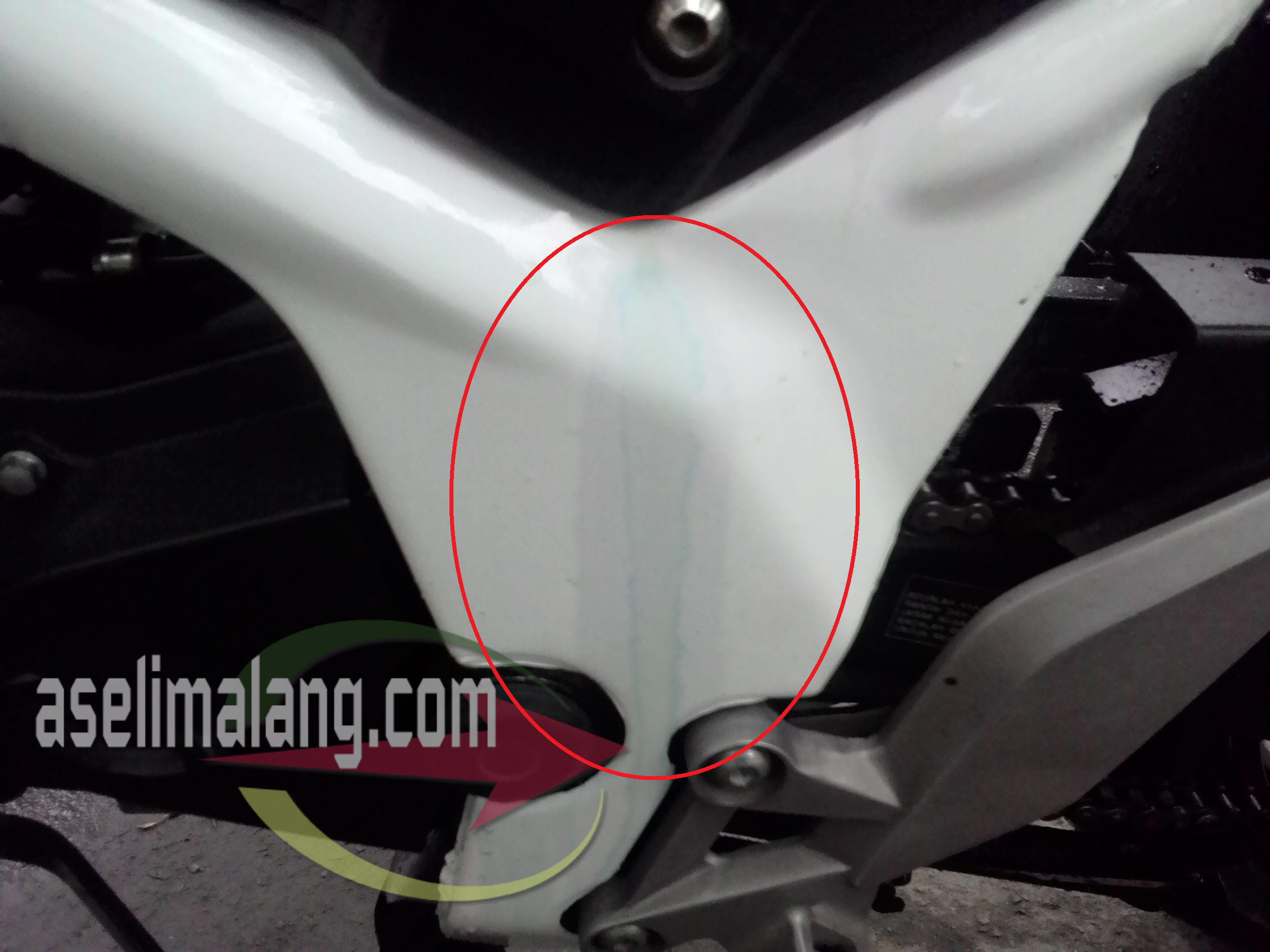 Melihat warna birunya, saia langsung berkesimpulan, ini pasti sisa luberan ngisi Pertamax tempo hari. Secara, beberapa hari ini, motor gak kena cairan apapun, kecuali air hujan dan cipratan banjir Nah, kok nodanya gak bisa hilang ya?