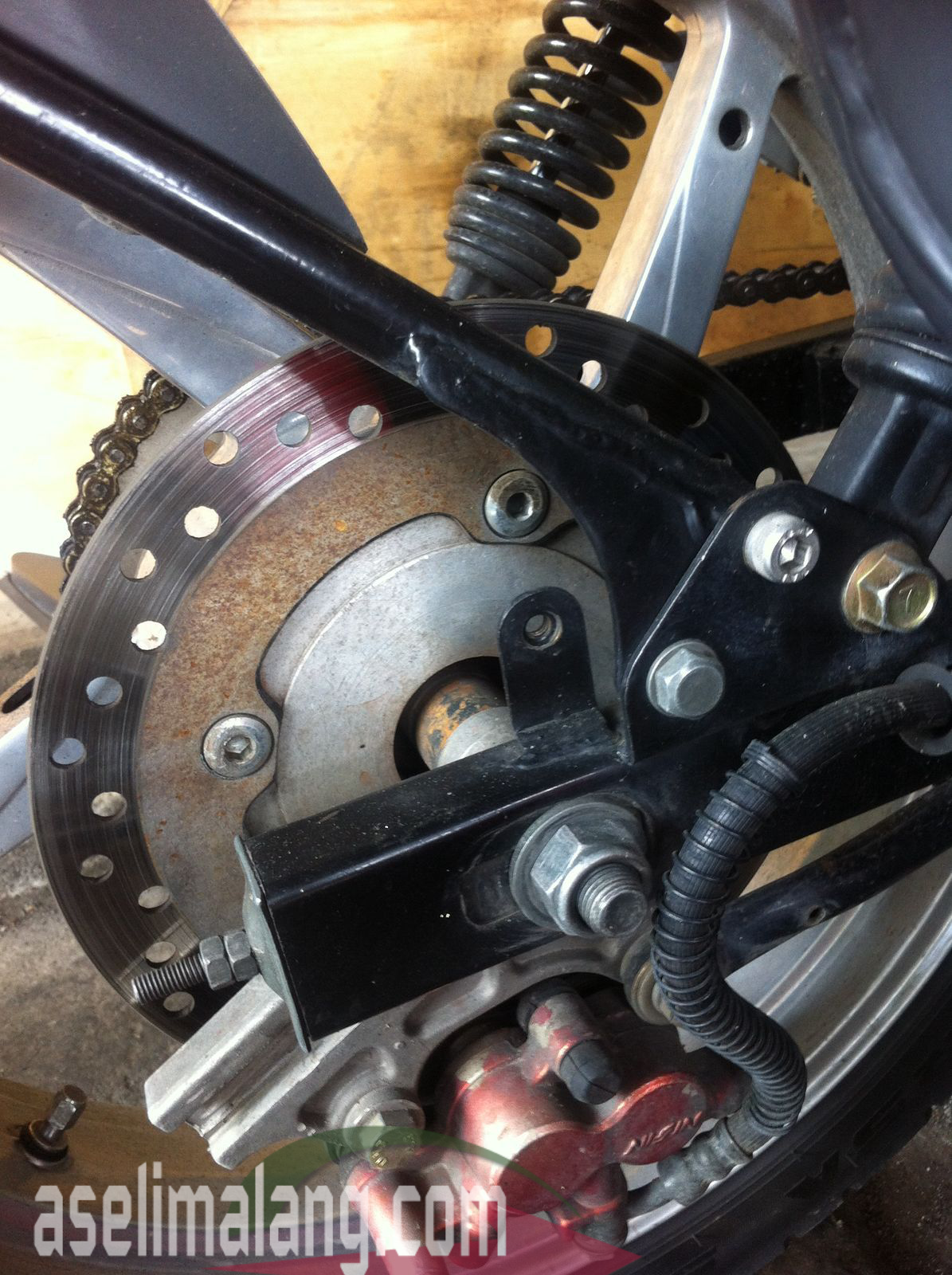 Lho?? Iya, karena bakalan terbentur dengan mudguard alias sepatbor belakang swing-arm bawaan P135. Richard tidak ingin melepas sepatbor langka itu, karena fungsinya yang vital. Dudukannya, memang langsung ke lengan ayun/swing arm. Solusi-nya, posisi kaliper cakram belakang mengalah, pindah ke bawah swing-arm, dibuatkan dudukan baru. Hati-hati ya, kuatir kebentur apa-apa di jalan π