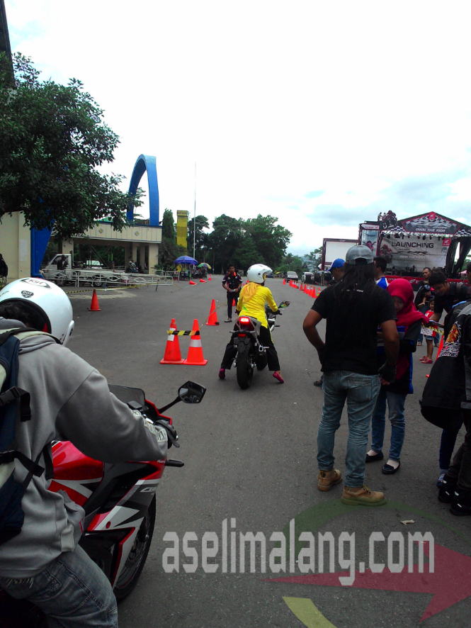 Seperti biasa daftar, isi formulir dan kupon undian, bla–bla-bla. Maaf, saat testride nggak ada foto saia ya, jangan pada kecewa π π π Lha gak ada yang bantuin ambil gambar, hehehe.. Kali ini, kebagian pas CBR warna putih. Perangkat safety saia pakai helm half face dan sarung tangan yang disiapkan panitia, jaket punya sendiri. Coba limiter, masih tetap, 10.500 rpm dah mbrebet. Sama berarti dengan Surabaya kemarin, hehehehe. Ya iya, wong settingan pabrikan itu. Start, saia coba panteng gas di rpm 7.000an lebih, lalu lepas tuas kopling. Hmm, sedikit wheelie nih π Mantap, meski tidak terlalu ekstrem. Saat roda depan kembali turun ke aspal, tidak terasa ada oleng, langsung menapak aspal. Lanjut oper gigi 2 sebelum limiter, hingga U-turn. Turun perseneling, colek dikit tuas rem depan, setang saia belokkan. Nyuss, langsung putar balik, dan jalan senormalnya. Meski aspal, bukan tempat yang pas untuk eksplore lebih tentang tenaga CBR ini. Kurang aman dan jelas kurang panjang kali lebar masbro.