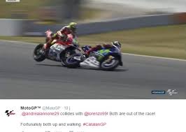 Terus, nasib Lorenzo? Apes alias sial, masih akrab dengan Lorenzo. Setelah disalip Rossi dan Marquez, terlihat performa Lorenzo seperti makin menurun. Diperparah, saat duel dengan Andrea Ianonne, sukses disenggol. Senggolan mesra Ianonne saat memaksa menyalip ini, dengan sukses membuat Lorenzo mendarat darurat di gravel dan tidak bisa melanjutkan lomba.
