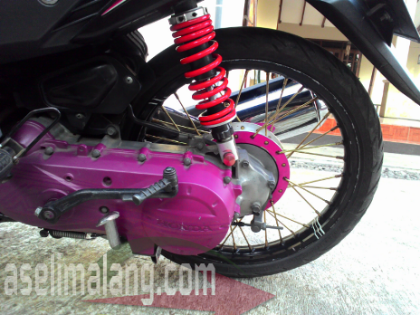 Perangkat pengereman, belakang masih tromol, sementara depan, sudah diganti dengan cakram lebar variasi. Pasti ajib nih, pikir saia. Sekilas, suspensi tak ada perubahan di bagian depan, yang belakang saja yang diganti aksesoris tanpa merk, berkelir merah.