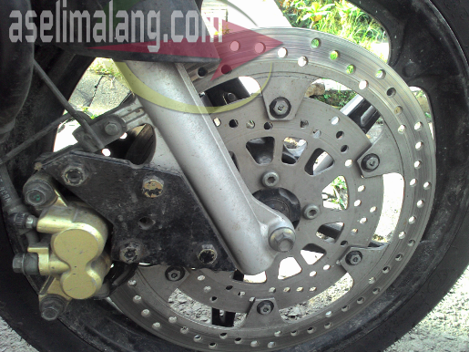 cakram5Soal kekuatan, gimana mas? Tanya saia. Mas-nya, saia lupa gak kenalan πŸ˜† , dengan enteng bilang, sudah saya pakai tahunan mas, gak ada masalah. Wow…beneran nih? Kalau iya tanpa masalah, salut juga. Bagaimanapun, modifikasi pasti ada sisi negatifnya kan… Kalau melihat bagian tepi piringan yang mulai termakan kampas rem, sepertinya sih sudah lumayan lama juga dipakai.