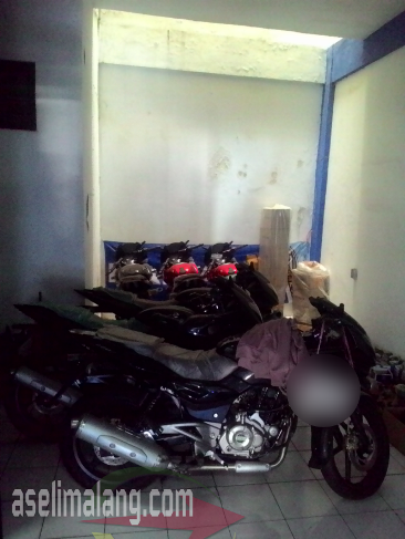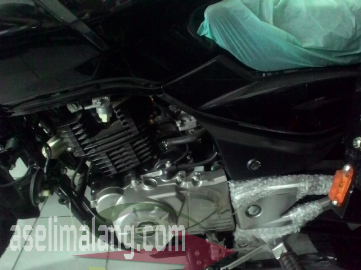 Sudah ganti bengkel 2 kali, part-nya susah. Sementara, maunya si bos, ya pakai part Kaisar. Akhirnya, meluncur deh ke bengkelnya, yang notabene masih sedia part-nya, meski rada mahal. Nah, pas habis konsultasi dengan mekanik, lalu ke bagian admin-nya, sekilas nampak jejeran 5 unit motor dengan mini fairing dan lampu proyektor di sisi kiri dealer. Sedikit tertutup oleh motor gerobak roda 3 dagangan dan tempat service. Tak asing, ini sama persis dengan yang saia coba seharian kapan hari, Bajaj Pulsar 220F. Saia mendekat, lalu ambil beberapa gambar.