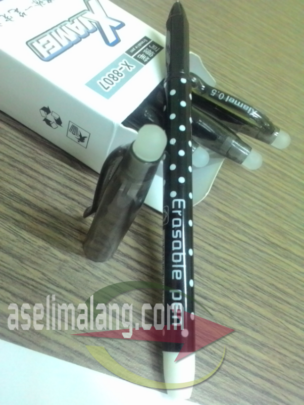Entah saia yang gaptek alias kurang gaul barangkali ya. Baru tahu, kalau sekarang, ada ternyata bolpoin/pulpen yang bisa dihapus πŸ˜† πŸ˜† Maksudnya, yang dihapus tuh hasil tulisannya, bukan pulpennya. Nah, berdasar penasaran tersebut, akhirnya saia nemu seorang seller di daerah Malang. Kebetulan saja, dekat tempat kerja. Tentang erasable pen sendiri, merupakan pena khusus, dengan tinta khusus serta dilengkapi friction alias penghapus dengan material khusus semacam karet keras, dibagian pangkal pulpen.