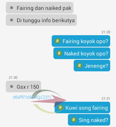 Nah, sekaligus langsung 2 model, itu yang akan dilakoni Suzuki. Model sport fairing untuk merusak pasar Honda CBR150R dan Yamaha R15, serta naked untuk meladeni duo penguasa, Honda New CB150R dan Yamaha New Vixion Lightning. Mantap..mantap. Semoga bsia menjadi titik balik kebangkitan Suzuki yang sejak ambrolnya dinasti mesin 2 tak, praktis, hanya disokong dari Satria F150 saja. Miris kan?? Lha, terus, kalau di Indonesia, mana dulu yang bakal dirilis? Sabar….dari informasi yang saia dapat, yang bakal rilis duluan adalah versi fairing, si GSX-R. Informasi ini, sebenarnya sudah cukup lama saia dapat, via salah satu ‘orang dalam’ . Sekitar bulan April 2016 lalu. Saat itu, sang informan menyatakan, kalau Suzuki bakal mengeluarkan 2 model sekaligus 150cc, yaitu sport fairing dan naked. Berikut screen shot percakapan informan dengan inisial Mr S ini