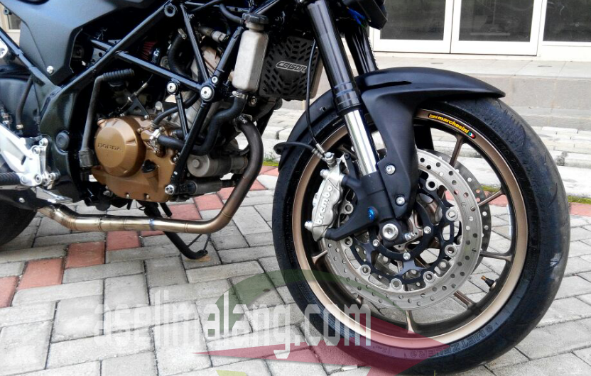 Untuk mengimbangi roda gede, piranti sokbreker dan swing arm jelas sudah diganti. Swing arm Megelli 250 yang terpasang sebelumnya, jelas gak muat, tak mampu menampung. Makanya, swing arm belakang, comot eks Honda CBR1000RR yang lebar, komplit berikut monoshock dan sistem link-nya. Sementara. garpu depan, mengambil suspensi Honda CBR600RR yang sudah bertipe up-side down/USD. Cocok nih, velg-ban besar, pake USD.