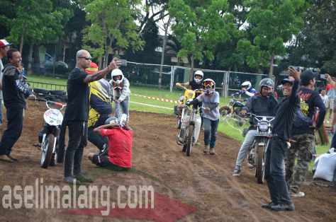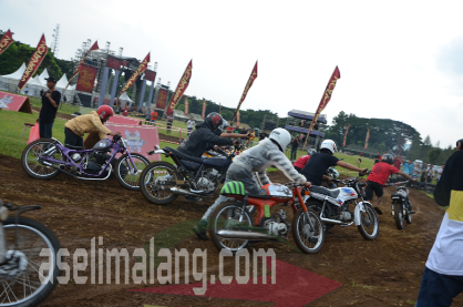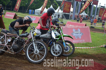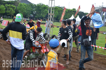 Masih dari even Suryanation Motorland 2016 yang digelar beberapa waktu lalu di Malang, Jawa Timur. Selain heboh dan seru berbagai acara termasuk gelaran utama yaitu kontes modifikasi ada lagi sebuah keseruan. Saia kurang begitu paham, apakah memang sudah disiapkan sejak awal oleh panitia, atau ide dadakan. Yang jelas, jadi rame dan heboh, menarik para penonton untuk mendekat ke lintasan yang sebelumnya dipakai balap retro. Apaan nih?