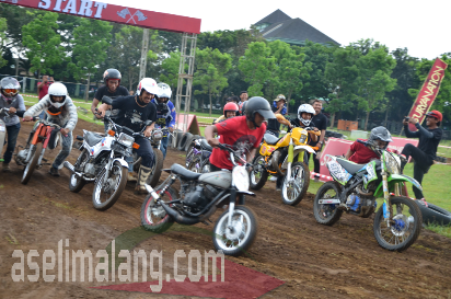 Karuan, joki yang semula percaya diri dengan tunggangan motor berspek balap garuk tanah, pusing bukan kepalang. Lha gimana nggak, itu motor modifikasi itu dimensinya tergolong bongsor/gede, dan jelas berat. Wadaaooo 😆 😆 Terhitung ada 3 joki motor yang terlihat “shock” dengan aturan baru itu, Yamaha Scorpio 225, Honda Tiger 2000 dan Honda CB modifikasi serta sebiji Kawasaki KLX 150. Modiar tenan, hehehehe…mana cuaca hujan, tanah basah dan licin. Sungguh kombinasi yang ideal Oh iya, karena ini balapan, maka perlengkapan safety harus tetap dikenakan. Mulai helm hingga sepatu. Catet…