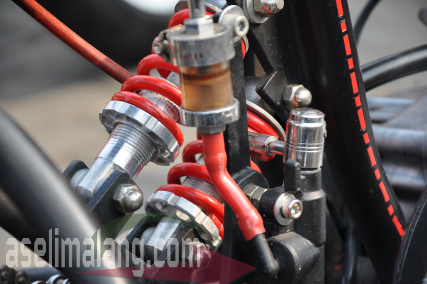 Mesin, juga sudah di upgrade, alias naik kelas. Lebih deh kalau 200 cc, melihat silinder blok yang aplikasi kepunyaan Tiger. Lha wong mainnya di kelas FFA 250 cc. Suspensi depan konstruksinya unik, dengan aplikasi semacam lengan ayun/swing arm. Ada sepasang sokbreker mungil persis di belakang komstir, posisinya diatas depan mesin.