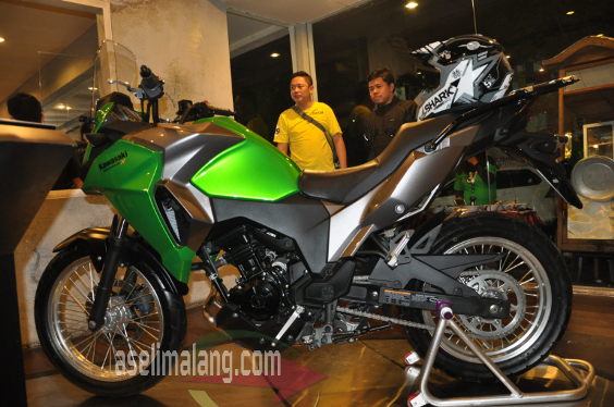 Launching resmi Kawasaki Versys X 250 untuk Jawa Timur memang sudah berlangsung di Surabaya 21/01/2017 lalu. Nah, untuk memperkenalkan Versys mini ini ke daerah lain, digelar acara roadshow ke beberapa kota di Jawa Timur. Malang, salah satunya. Acara pengenalan Versys X 250, dikonsep secara santai. Melibatkan komunitas dan klub Kawasaki di Malang, mereka diajak santai, tidak ada acara yang terkesan ceremonial. Khas bikers pokoknya. Kongkow, nongkrong sambil ngemil, ngobrol dengan sesama biker, sekaligus bisa mengamati lebih dekat, bahkan bisa jajal merasakan duduk di atas jok Versys 250. Lho, nggak ada sesi testride? Nggak ada sementara ini masbro…lha wong acara malam hari, hujan pula. Hehehehe…