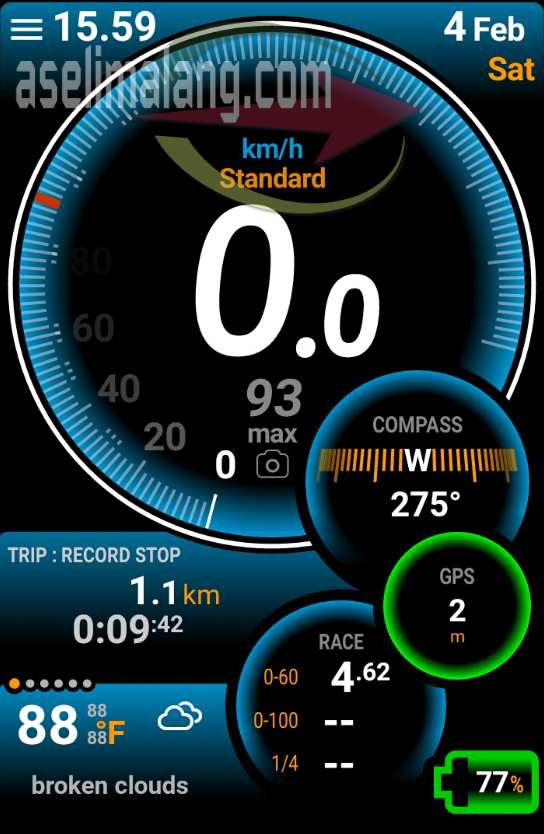 Saia coba gas di sebuah jalan perumahan yang cukup sepi, lalu coba ulang dengan aplikasi android yang berbasis GPS. Ternyata, nggak terlalu jauh penyimpangan angka di speedometer. Maklum, kan kecepatan dibawah 100 kpj, kalau diatasnya, bisa jadi mulai ada penyimpangan. Faktor keamanan itu mah, sudah diatur dari pabrikan 😉 Berikut hasil capture gigi 1 dan 2 dari aplikasi Ulysse speedometer