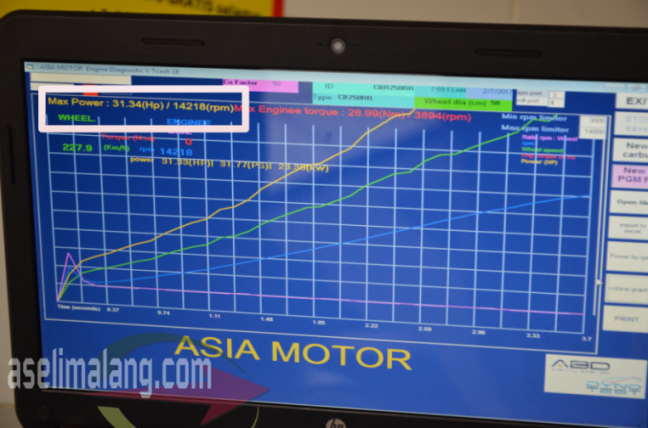Nah, rasa penasaran yang timbul, betul nggak sih, klaim pabrikan tentang tenaganya?  Sebuah media otomotif pernah merilis hasil tes dyno mereka, dan hasilnya, power on wheel CBR250RR adalah di angka 31,8 HP. Daripada penasaran, saia bawa, eh, naikin ding, Honda CBR250RR ini ke bengkel AHASS Asia Motor di area Sulfat, Malang. Bengkel ini punya perangkat dyno, yang cukup relevan hasilnya, meski tergolong ringkas dan sederhana.