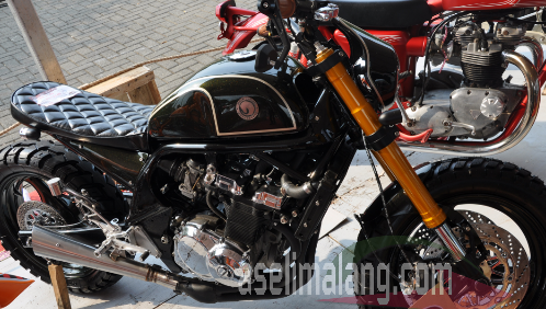Di tangan kru kreatif, tampilan standar motor naked ini berubah menjadi street tracker yang garang. Sasis alias rangka, sebagian besar masih mengandalkan ori bawaan, Hanya bagian buritan, dipotong lebih pendek, pas untuk seorang saja. Single seat, dengan dibalut jok bermotif kotak-kotak manis.