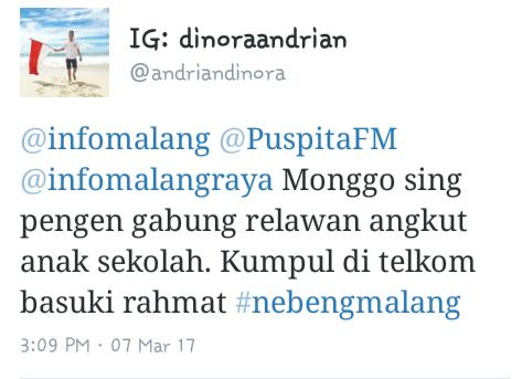 Nah, sejak awal mogok, bermunculan semacam komunitas yang peduli akan penumpang yang kleleran, terutama pelajar. Seperti yang satu ini. Berawal dari solidaritas, beberapa pengendara sepeda motor berkumpul di depan Telkom Kayutangan. Mereka nggak demo, tapi justru menyiapkan diri, mengantar pelajar yang hendak pulang sekolah. Entah itu pelajar SD, SMP atau SMA. Komunitas Tilang Malang ini, terdiri dari berbagai profesi. Awalnya, mereka merupakan penggiat Peduli Lubang, yang antara lain kegiatannya, seperti pernah saia tulis disini, yaitu menandai lubang jalan di Malang Raya. Ternyata, kepedulian mereka meluas, hingga menjadi relawan pengantar pelajar.