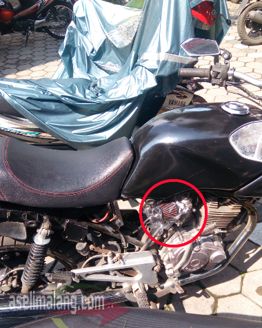 filter2Rupanya, ini adalah salah satu antisipasi sang pemilik, supaya kala parkir dan kehujanan, air tidak membasahi filter udara yang sudah aplikasi model open filter. Sang filter bermodel open filter, nggak ngeh sih, merk-nya apaan, dibungkus dengan kantong plastik kemasan 1/2 kiloan. Tujuannya, jelas, supaya gak kena air dan gak basah.