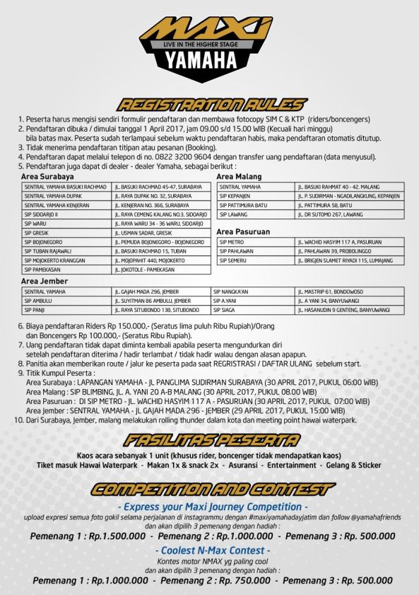 Ada juga kontes modifikasi bertajuk Coolest NMax Contest. Widih…aseek, jutaan rupiah hadiahnya masbro. Oh iya, setelah mendaftar, siapkan rider-boncenger dan motor untuk kumpul di beberapa titik kumpul terlampir, yaitu di Surabaya, Malang, Pasuruan dan Jember.. Nantinya, akan berangkat bersama menuju lokasi alias rolling thunder. Eh, ada bocoran bonus nih, bakal ada testride spesial dari Yamaha. Hayo, nyoba motor apaan? New R15? Xmax250? Hemms…tunggu tanggal mainnya deh…