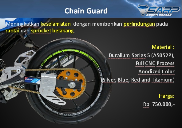 - Chainguard. Sesuai namanya, alat ini berfungsi melindungi rantai dan gir/sproket belakang ketika tiba-tiba rantai kendur. Jamaknya sih dipakai di motor-motor trail atau adventure. Berbahan duralium, siap ditebus dengan harga IDR 750.000. Ada 4 pilihan warna anodized yang siap dipilih.