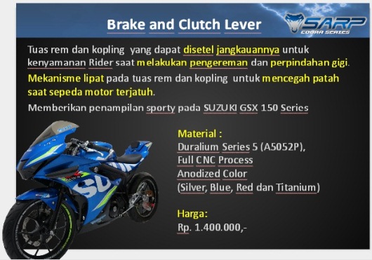 - Tuas rem dan kopling racing. Barang ini , lebih lentur dan fleksibel dibanding tuas rem dan kopling bawaan, dan juga ada fitur pengaman ekstra, yaitu otomatis terlipat kala terkena benturan ekstrem, jatuh misalnya. Kebihannya lagi, ini tuas bisa disetel. Suka setelan dangkal, rendah atau sebaliknya, tinggal rubah saja. Benda ini sepasang dijual dengan harga IDR 1.400.000