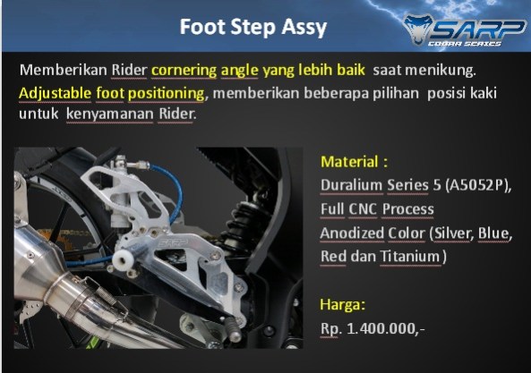 - Footstep. Nah, yang ini, memberikan perubahan pada posisi riding sang pengemudi. Piranti yang biasa disebut underbone ini, membuat posisi kaki rider lebih mundur dan sedikit lebih tinggi dibandingkan dengan posisi kaki saat menggunakan footstep bawaan yang asli. Tujuannya apa dong? Supaya, kala miring-miring seperti kawan-kawan saat cornering, bisa lebih miring lagi. Bingung? Pokoknya, membuat jarak bagian yang berpotensi menyentuh aspal seperti footstep asli, lebih jauh. Miring bisa lebih dari sebelumnya, nggak khawatir gasruk aspal. Berbahan duralium, dengan beberapa pilihan warna anodized, benda ini sepasang dihargai IDR 1.400.000