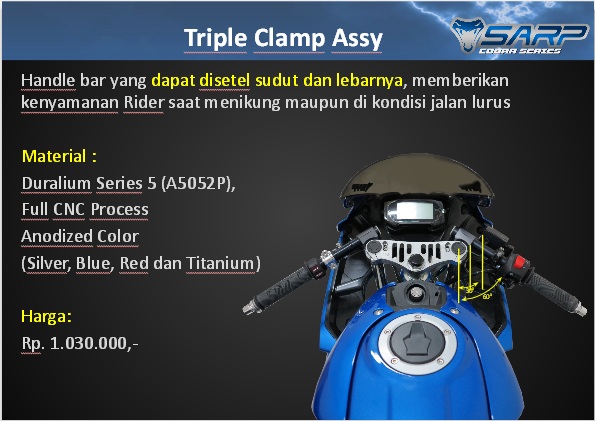 - Triple Clamp Assy. Perangkat sepaket, yang terdiri dari segitiga atas dan setang jepit ini, PnP, tinggal pasang menggantikan bawaannya. Paket yang dijual IDR 1.030.000 ini memberikan posisi riding yang lebih racy, merunduk dengan sudut setang yang bisa disetel. Mau rapat atau rada lebar, tinggal setel saja.