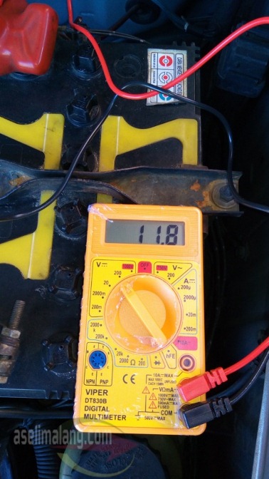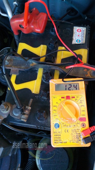 Cara ini, saia coba praktekkan sendiri di mobil orang tua, yang kebetulan keluaran rada lawas, 2001. Usia aki sudah 2 tahunan, dan pas kapan hari, katanya Bapak, kok rada susah starter. Cek pakai multitester, set pada pengukuran tegangan/voltage. Jangan lupa, selalu set multitester diatas nilai yang akan diukur. Misal setrum DC yang akan diukur 12 volt, jangan diset 10V DC. Jebol ntar itu alat. Silakan set pada 50V DC. Kondisi beban kelistrikan mati, mesi juga mati, saia peroleh hasil 12,4 volt. Wah, bagus nih kalo merujuk ke tabel diatas.