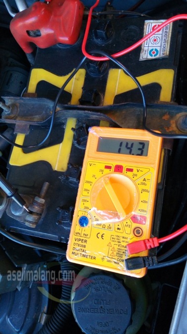 Terakhir, ukur dengan beban penuh dan mesin kondisi menyala. Saia peroleh hasil 14,3 volt. Wah, sedikit diatas dari  hasil tabel. Yah, yang penting kondisi tegangan aki masih bagus kalo saia bilang.