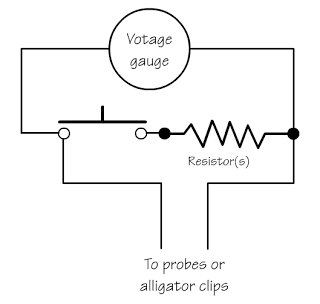 Basisnya sih sederhana, yaitu alat ini melakukan simulasi pembebanan dengan mengggunakan sebuah resistor atau variabel resistor tergantung kebutuhan.  Kalau skema rangkaian inti sebuah load test battery kira-kira seperti ini.