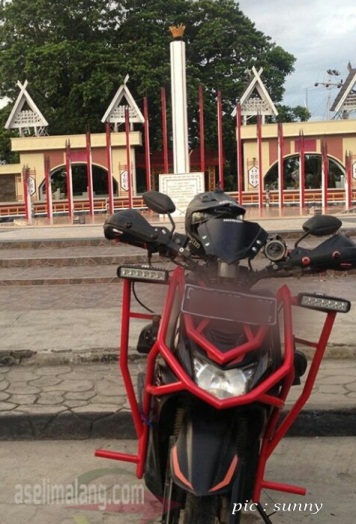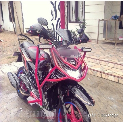 Selain meninggikan suspensi, dirakit pula pipa besi batangan yang dibentuk semacam tubular mengelilingi bagian bodi samping dan depan. Pipa besi yang diameter dan ukurannya saia lupa tanya, terpasang di bagian depan dan dicat mencolok dengan warna merah. Hmm…ingat kepunyaan Yamaha X-Ride lama, yang versi adventure, kan ada tubularnya juga meski minimalis di sisi sayap dan bodi belakang.