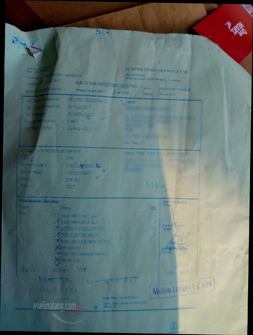 - Pastikan kondisi fisik motor saat dipilih di dealer, sama dengan saat motor diantar ke rumah. Bila saat di dealer pilih warna hitam glossy misalnya, jangan sampai keliru, saat diantar malah motor yang berkelir hitam doff. Meskipun sudah tercatat dalam sistem serta surat – surat yang dibawa oleh bagian pengiriman, namanya kesalahan , mungkin saja terjadi. Yah, syukur-syukur sih, beli NCB ketukar, diantar CRF, maknyus to