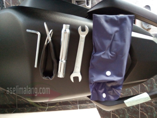 - Periksa tool kit bawaan motor yang terselip di kotak kecil di bawah jok. Isi standarnya adalah kunci L4, kunci busi, sling pengikat helm serta kunci pas 10/12 didalam wadah berwarna biru.