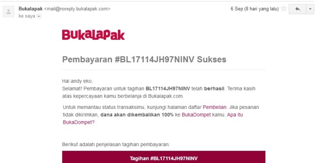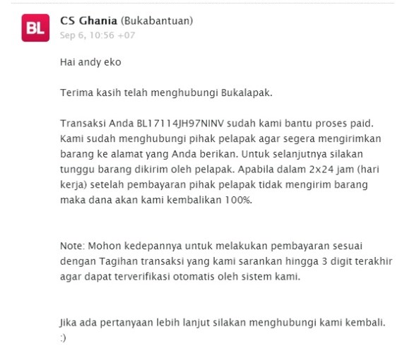 Dan akhirnya, 2 jam kemudian ada email masuk, kembali dari bantuan bukalapak. Memberitahukan bahwa telah menindak lanjuti laporan saia, dan melakukan proses paid alias pembayaran pada pelapak, serta meminta pelapak segera mengirimkan barangnya. Wehehehehe…