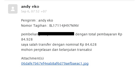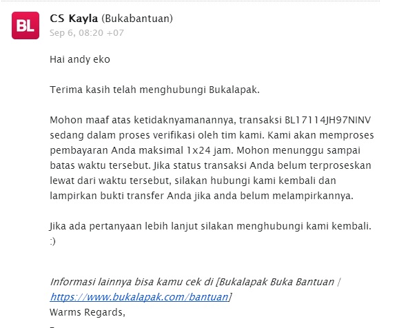 Seharian saia tunggu, kok nggak ada konfirmasi kalau pembayaran sukses. Justru yang ada malah pembatalan transaksi. Waduh…ruwet ini. Sudah dibayar masak sepihak dibatalkan? Saia langsung menghubungi customer service bukalapak melalui email. Saia sampaikan kalo sudah transaksi dan dibayarkan melalui ransfer, tapi terjadi kesalahan nilai transfer. Harusnya IDR 84.928, tapi yang terkirim IDR 84.628. Saia lampirkan pula struk bukti transfernya, sambil berharap-harap cemas, moga aja itu duit nggak hilang 😦