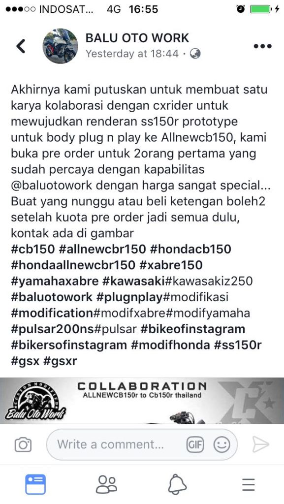 Dan ternyata, olah kreatif mas Ari ini dilirik oleh salah satu rumah modifikasi di Jogjakarta. Balu Otowork, pasti sebagian besar penikmat modifikasi sepeda motor pasti sudah kenal nama ini. Sebuah gerai modifikasi di daerah Giwangan, Jogjakarta. Spesialis di bagian body custom sepeda motor, rumah modifikasi ini banyak disambangi pemilik motor yang tidak puas dengan penampilan body standarnya. Balu Otoworks, menggandeng mas Ari, untuk mewujudkan cita-citanya, eh, kreasinya, menjadi nyata. Yaitu menyiapkan part body modifikasi khusus untuk Honda New CB150R yang bercita rasa Exmotion. Muantapp tenan deh…