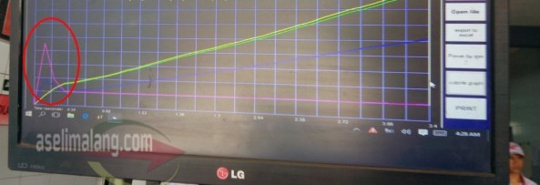 Terlihat, di awal, ada grafik macam gunung lancip tinggi saat putaran awal mesin. Nah ini biangnya, ini merupakan efek dari menipisnya kamkop. Putaran mesin di rpm awal, tidak mulus karena harusnya sih naik bertahap rada mulus. Meskipun ada grafik menaik, tidak seharusnya ekstrim setinggi itu.