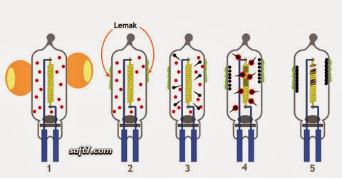 “Jadi begini bu, pegang bohlam halogen memang nggak boleh kena kacanya, bakal cepat putus bohlamnya” saia jelaskan ke ibu itu. “Kok bisa mas?” selidiknya. Alasannya begini, tangan kita, jari maksudnya, permukaannya memiliki sidik jari yang mengandung minyak, sehingga bila kita memegang bagian kaca bohlam halogen dengan menggunakan tangan langsung secara otomatis sidik jari kita (yang mengandung minyak) akan menempel pada bagian kaca. Gampangnya, pas pakai HP android , kan sering kelihatan tuh bekas jari di layarnya? Semacam itulah bekasnya yang bisa menempel pada kaca bohlam. Sewaktu si bohlam dinyalakan dan menghasilkan panas, bekas jari tadi akan menimbulkan perbedaan suhu pada bagian kaca yang dapat mengakibatkan lampu mudah sekali putus/rusak. Jadi, panas yang diterima bagian kaca bohlam nggak merata, karena ada lapisan bekas jari di beberapa bagian. Panas nggak merata ini, membuat tekanan gas halogen didalamnya juga nggak stabil, walhasil cepat putus deh itu filamen. Kira-kira gambarannya kayak gini deh (saft7.com)