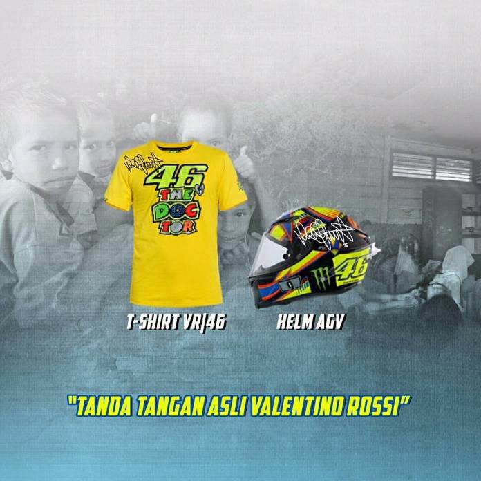 Dari lama akun @yamahaindonesia , lelang ini berbentuk penggalangan dana untuk pendidikan di pulau Salura, NTT. Pemenang lelang, selain mendapatkan si kuning Vixion R 155 limited edition, juga berhak membawa pulang berupa T-shirt dan helm AGV bercorak the doctor Valentino Rossi plus tandatangan asli. Widih…