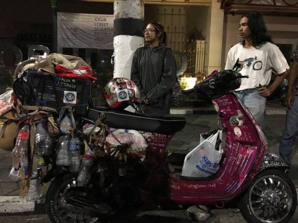 Sementara skuter satunya, selain tampil unik dengan gaya ala ratbike tapi tanpa corat-coret , masih juga dipenuhi dengan gantungan kemasan minuman air mineral, botol plastik dan sejenisnya. Busyet ..