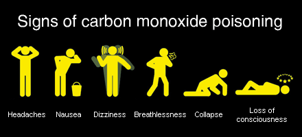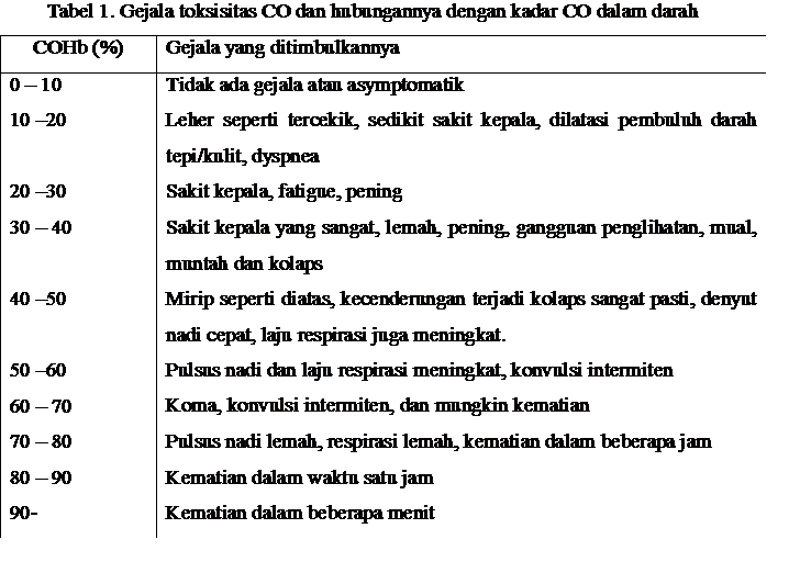Berikut ini adalah tabel skala keracunan gas karbon monoksida/CO dan beberapa gejala yang dapat terbaca dari fisik manusia yang terkena.