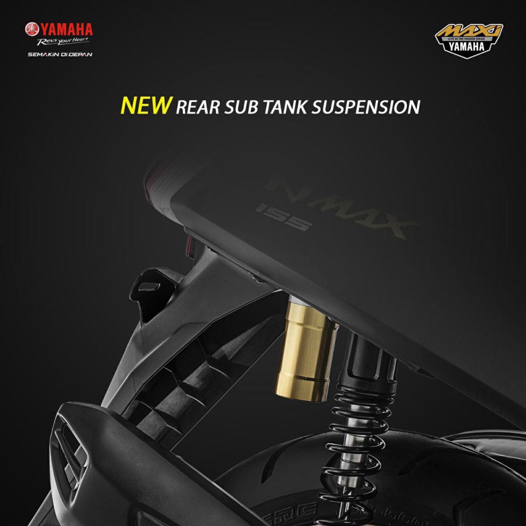 Ada lagi nih perubahannya. Semua varian, kini mengadopsi sokbreker belakang model baru, model tabung terpisah. Weh, mirip saudaranya Aerox R nih. Disinyalir, redaman lebih nyaman meski belum ada testimoni dari yang sudah jajal NMAx baru ini.