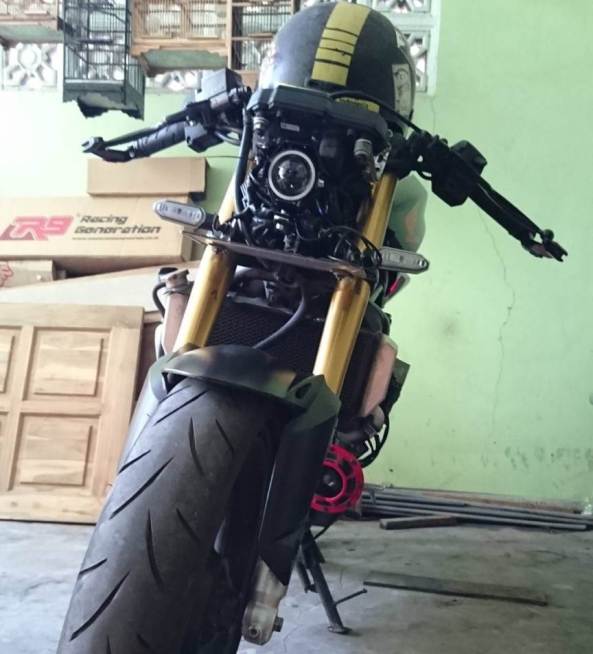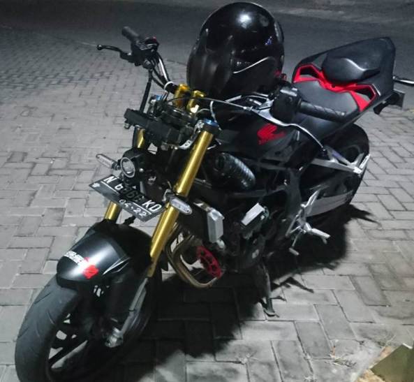 Yang butuh perubahan, adalah di sektor setang. Sempat menjajal tampilan naked dengan setang jepit standar bawaan CBR250RR, jadinya malah wagu alias nggak enak dilihat serta kurang pas. Karena setang CBR250RR aslinya adalah setang jepit yang terpasang underyoke alias dibawah segitiga.